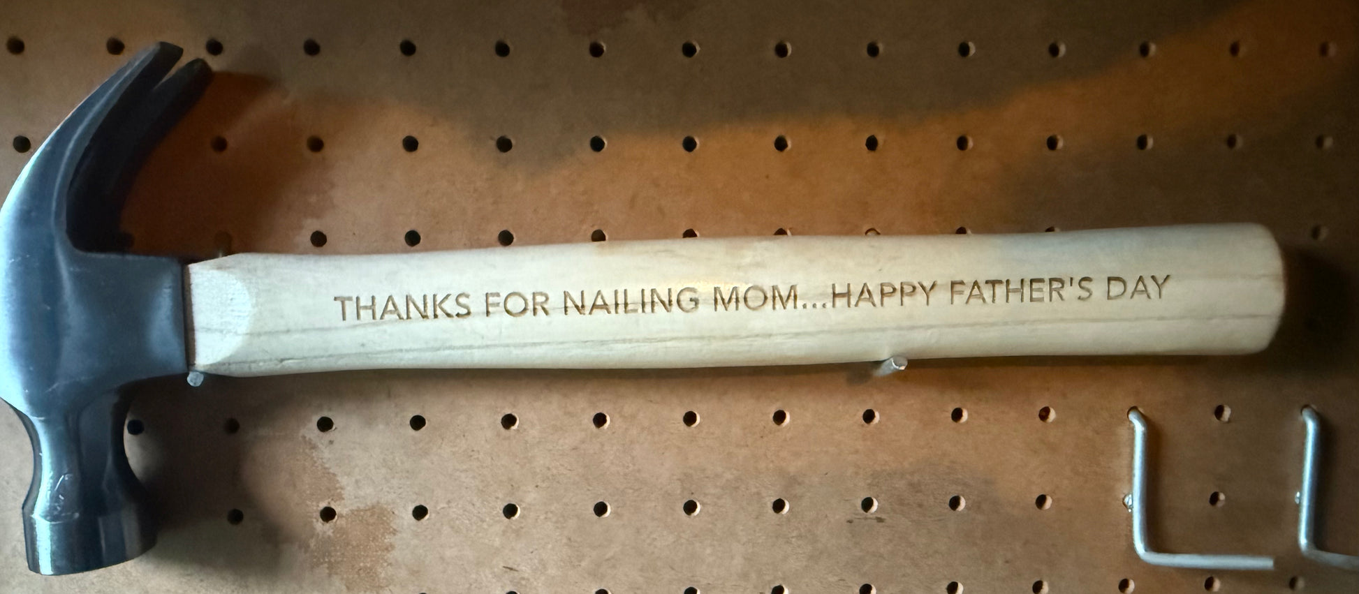 Looking for a gift that hits the mark and the funny bone? This custom-engraved hammer is the ultimate dad joke turned into a keepsake. With the hilarious message, "Thanks for nailing Mom", it’s the perfect combination of heartfelt appreciation and awkward comedy gold.