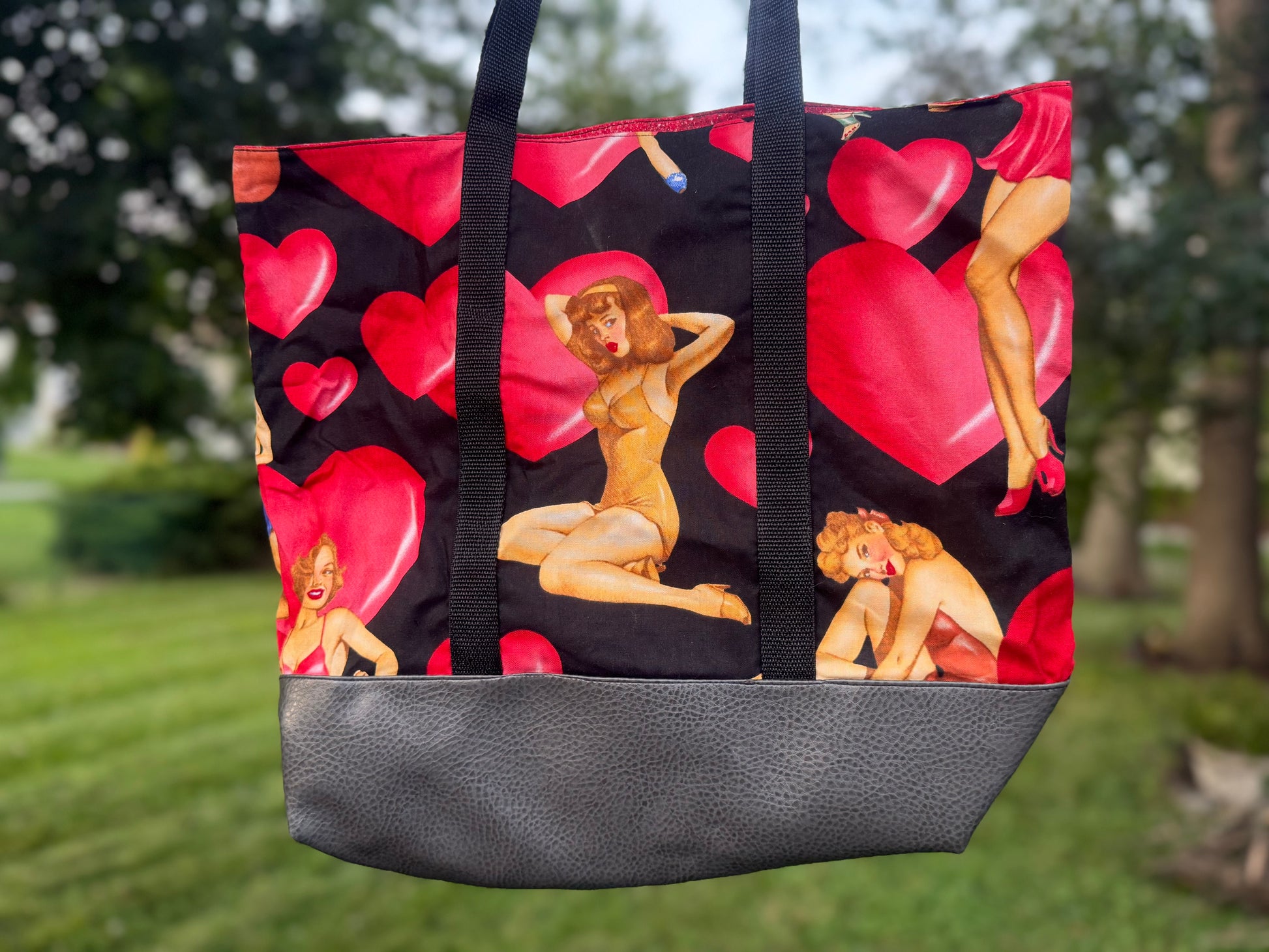 A tote bag featuring a pin-up girl theme fabric is a stylish and functional accessory. The bag combines the practicality of a tote with the retro charm of pin-up art. This bags features vibrant, eye-catching designs with classic pin-up illustrations with a vintage or retro aesthetic.