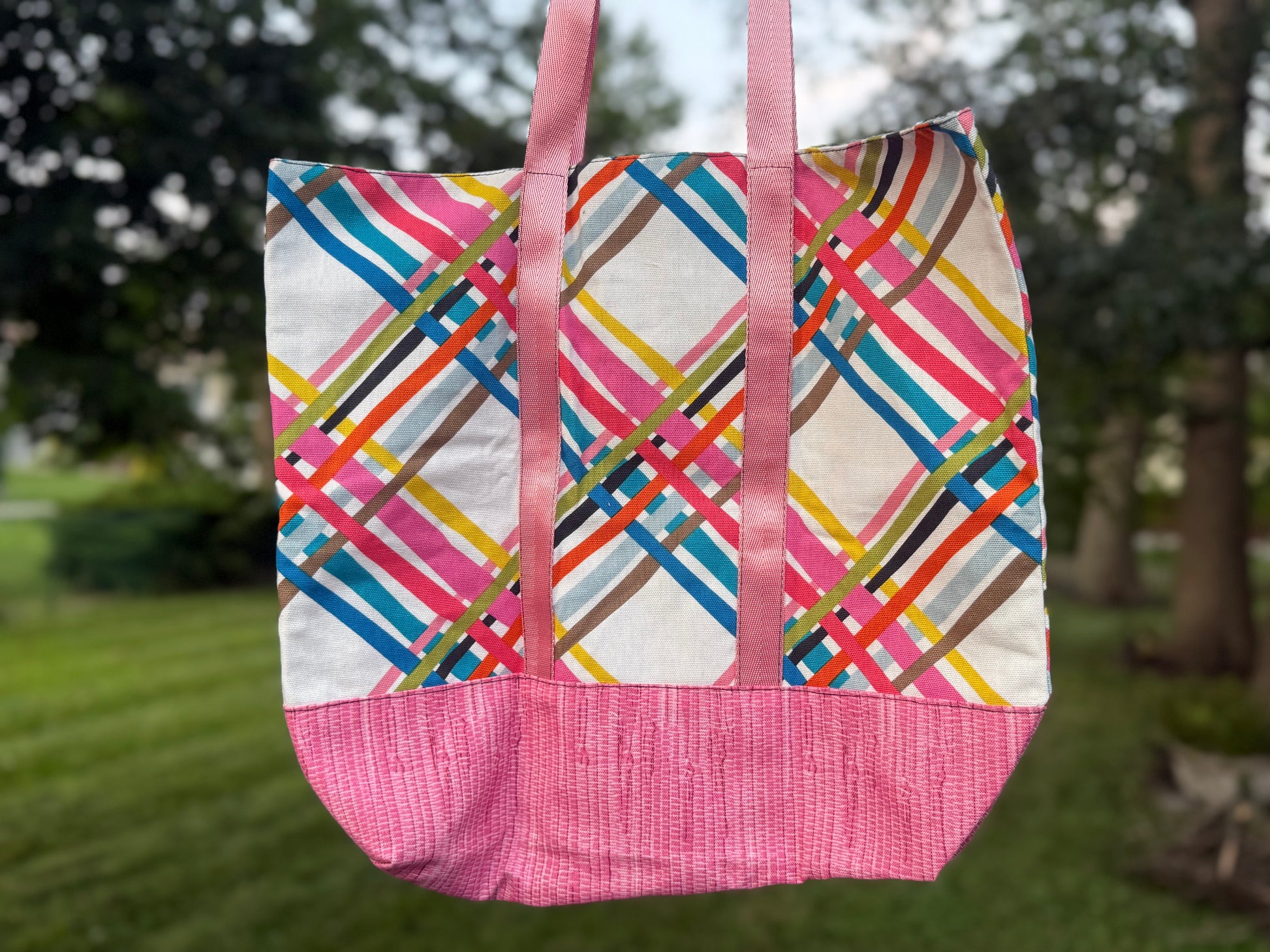 A tote bag crafted from pink and striped fabric offers a cheerful and vibrant aesthetic, making it a stylish and versatile accessory.
